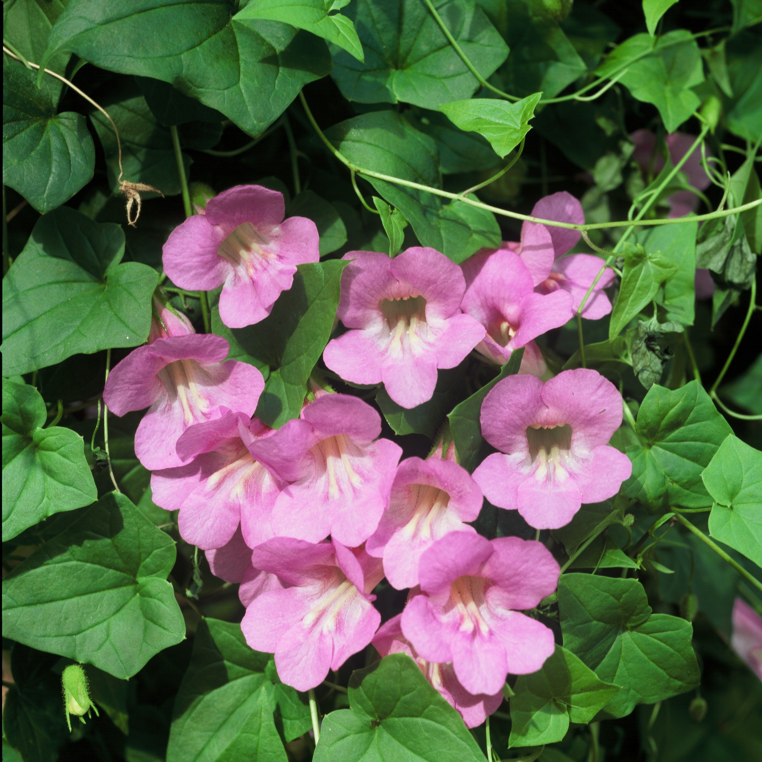 This gorgeous climbing vine can reach up to 3 meters tall, and is covered in large pink snap-dragon-like flowers! Plants are perennial in warm climates.