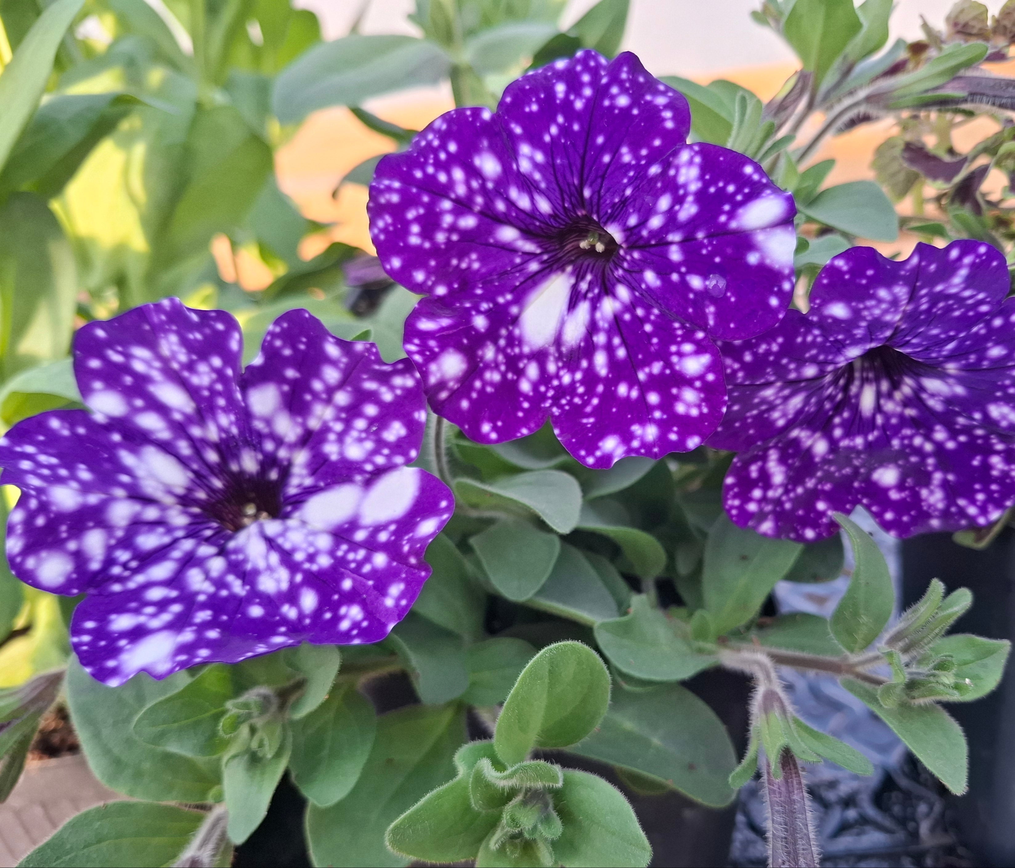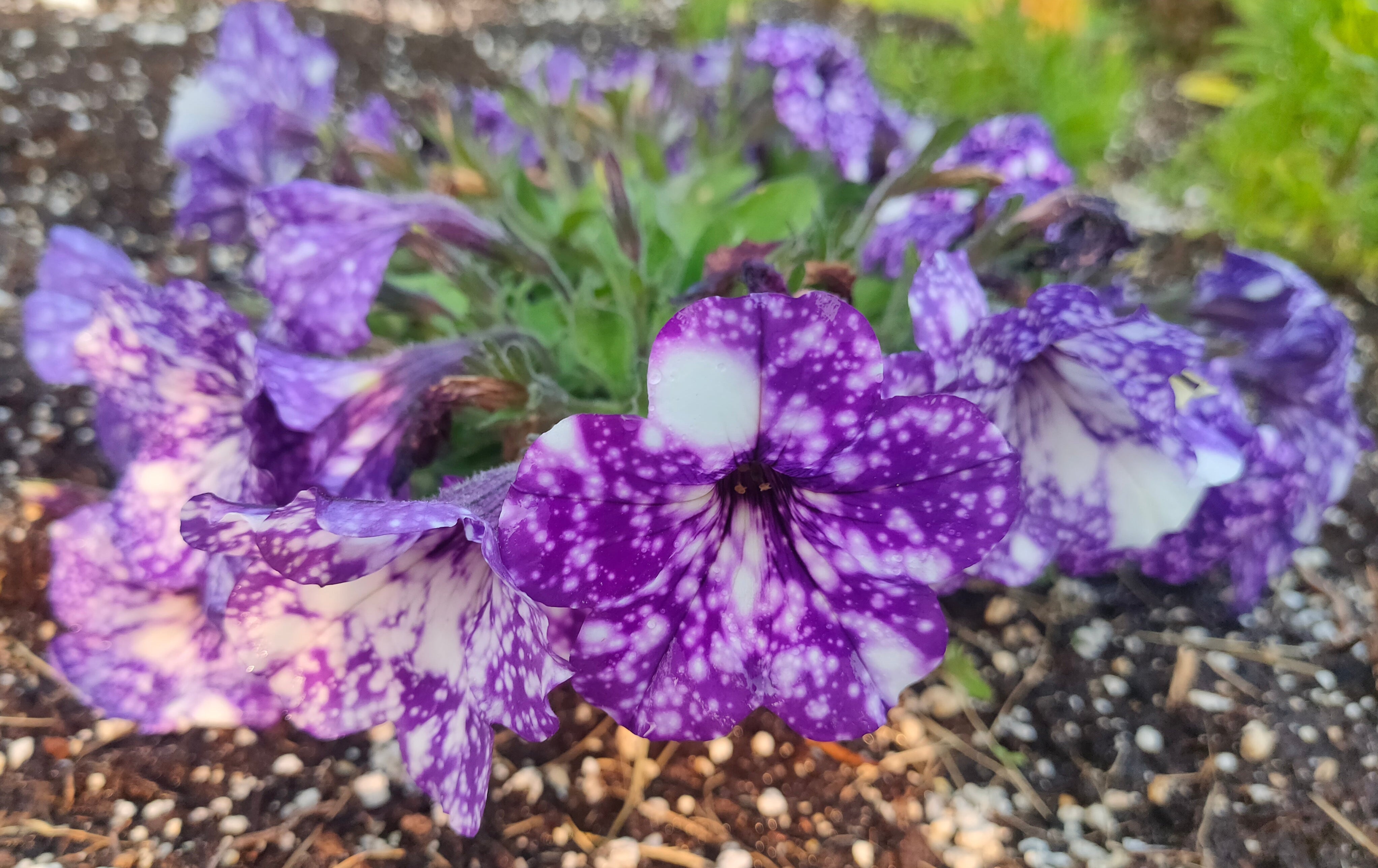 Unique and eye-catching Petunia with spots and stripes! Shades of blue and purple, with white markings. A stunning centerpiece in planters, baskets, and at the front of the garden.