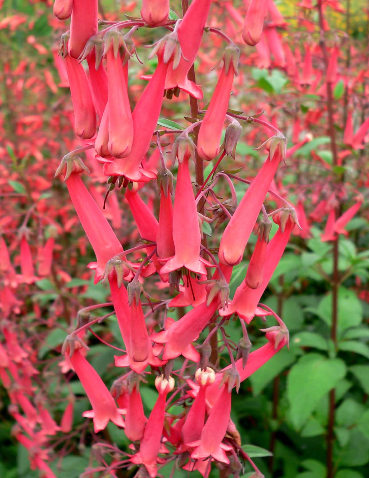 Cape Fuchsia is a semi-evergreen shrub with narrowly tubular flowers 5 cm (2 in) long. The flowers are of an orange-pink colour along the outline of the petals, with a yellow center. The flowers often point back towards the stem. The plant has an exceptionally long blooming season of roughly six months, from May to November.