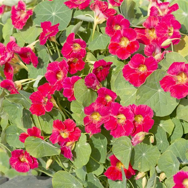Glorious raspberry-rose fragrance! A strong, compact nasturtium. Unique and showy rose-colored flowers are showcased above medium-green foliage.