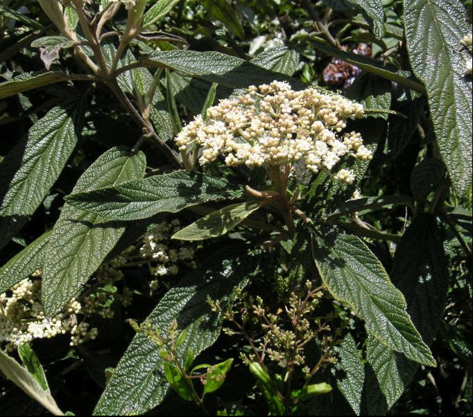 A hard-to-find shrub with soft think leather-like foliage that is evergreen! Creamy white flowers in 4" flat-topped clusters that bloom in spring, followed by red fruit that turns black when ripe.