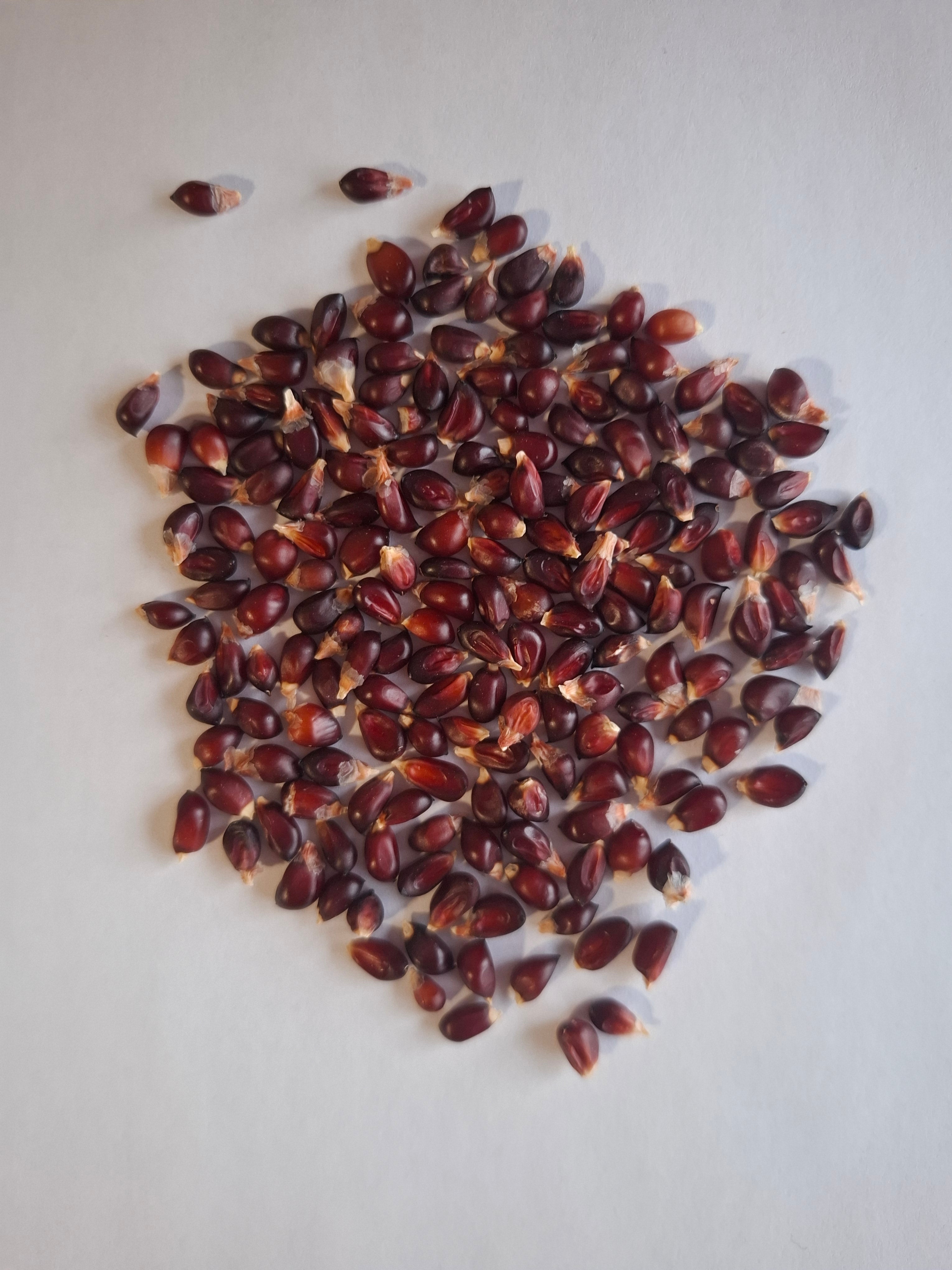 A beautiful popcorn with kernels that ripen and dry to a bright red. The compact ears are popular used for popped corn, delicious and crunchy! Once popped, the kernels are white. They are also great for decoration as they dry well and hold color well. Stalks grow to 5-6ft. The dried cobs make excellent gifts, including hostess gifts, and a great idea for kids birthday parties! An heirloom variety.