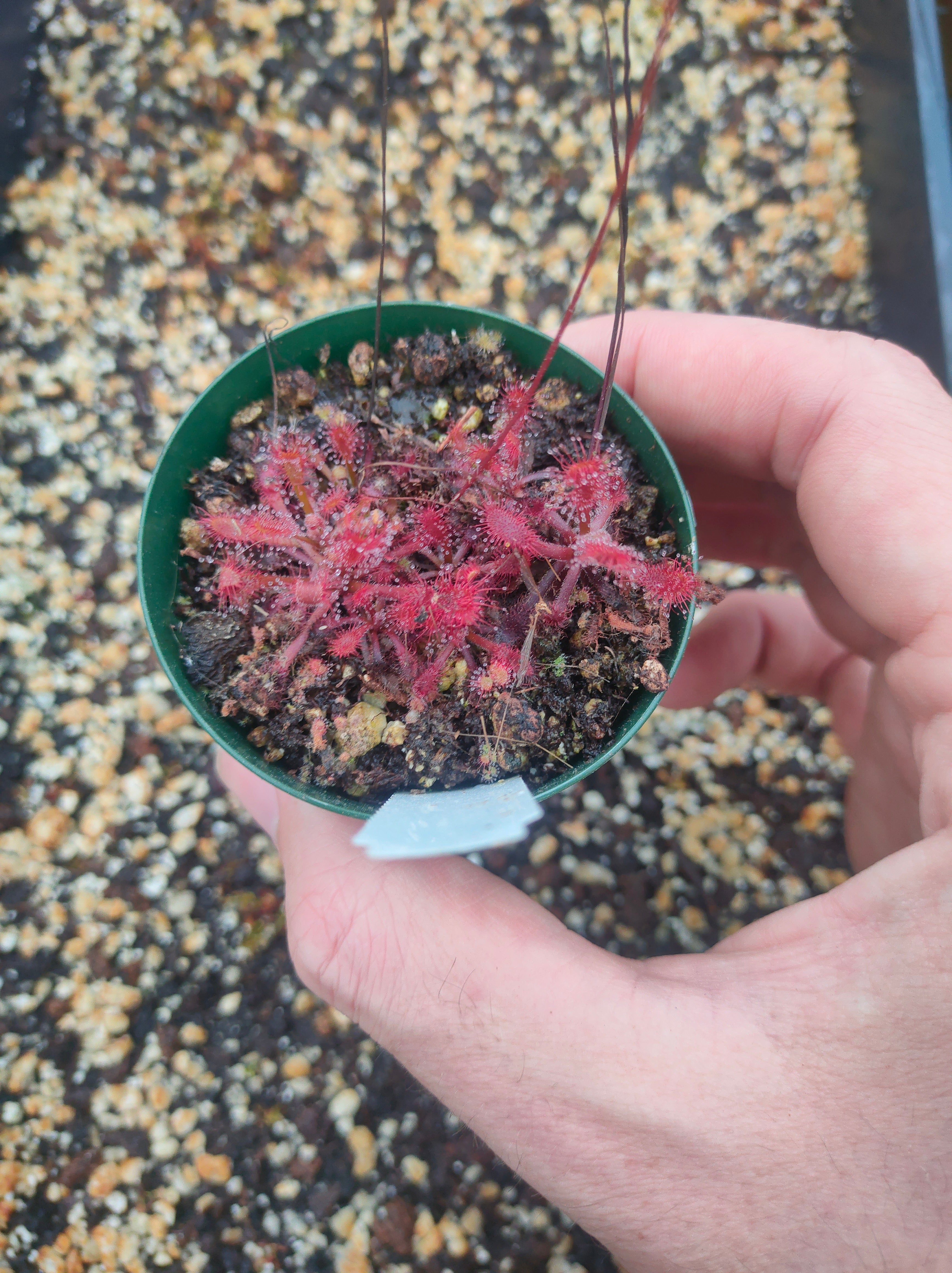This Drosera is native to South America, growing in sub-tropical to tropical settings. When it gets enough light, the strap shaped leaves turn a bright red. If grown under grow lights, it may have a greener colour.