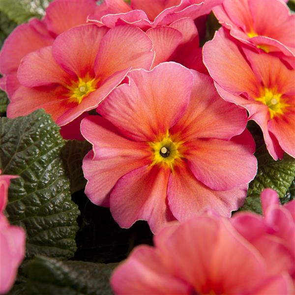 Compact plants produce clusters of large blooms in vibrant colors with textured leaves.