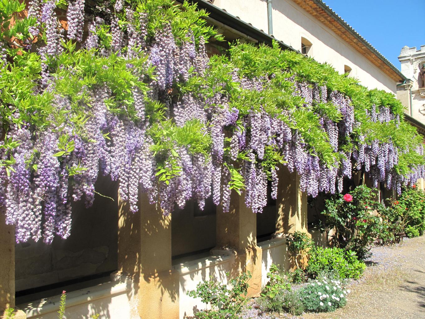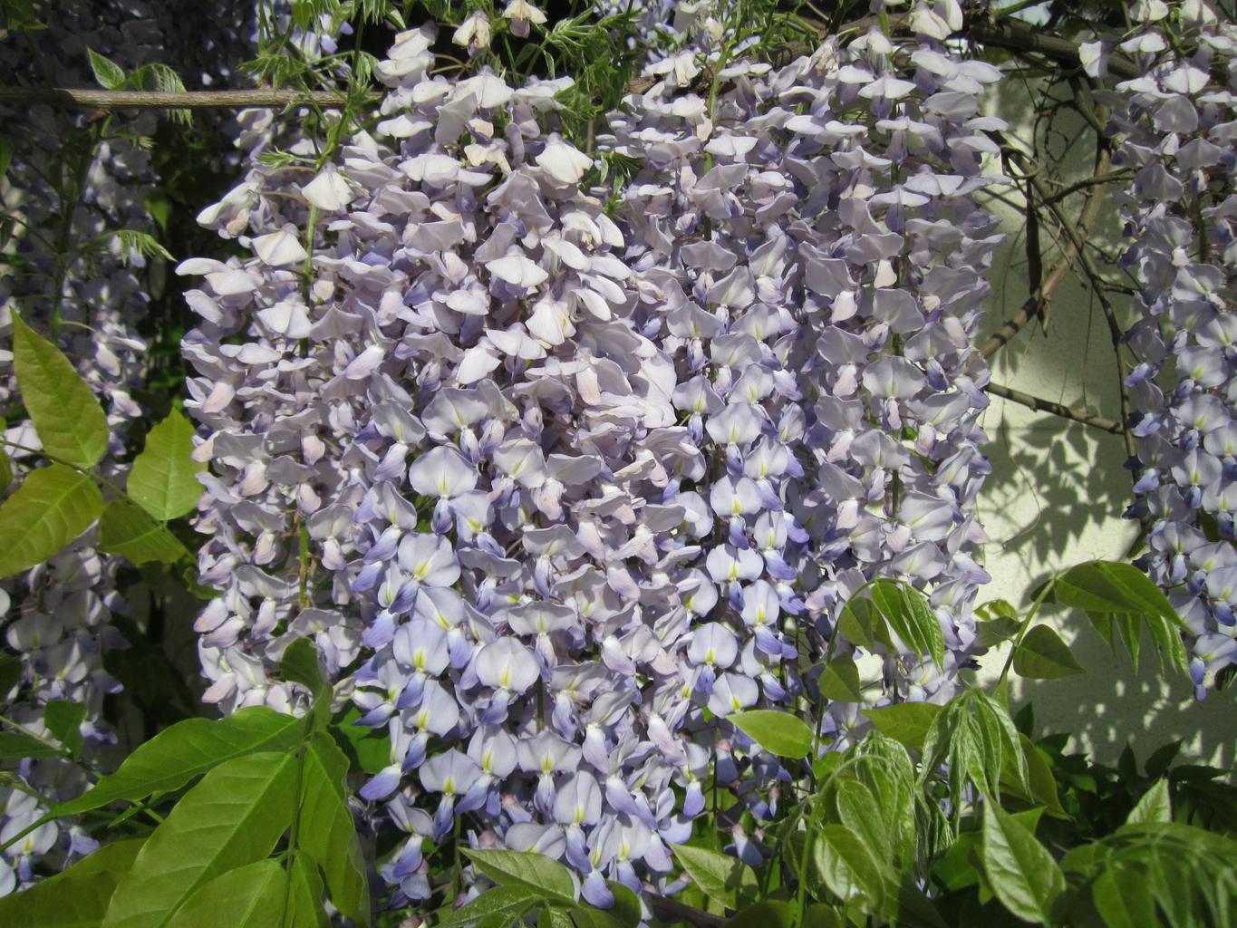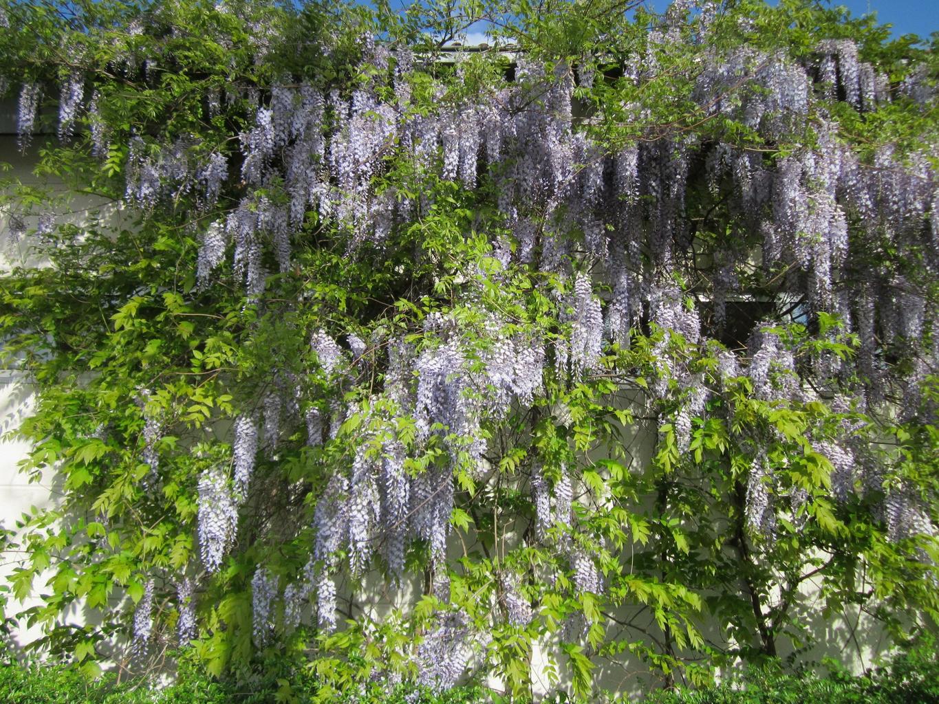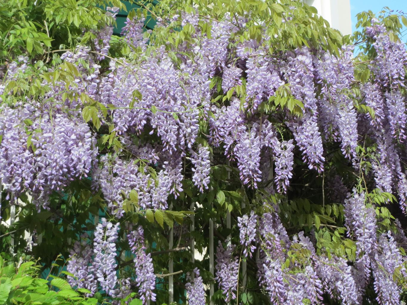Wisteria floribunda has the longest racemes (flowers) of all the species, nearly half a meter in length! It provides a dramatic display on garden structures such as pergolas where the racemes can hang free, unimpeded by branches or foliage!