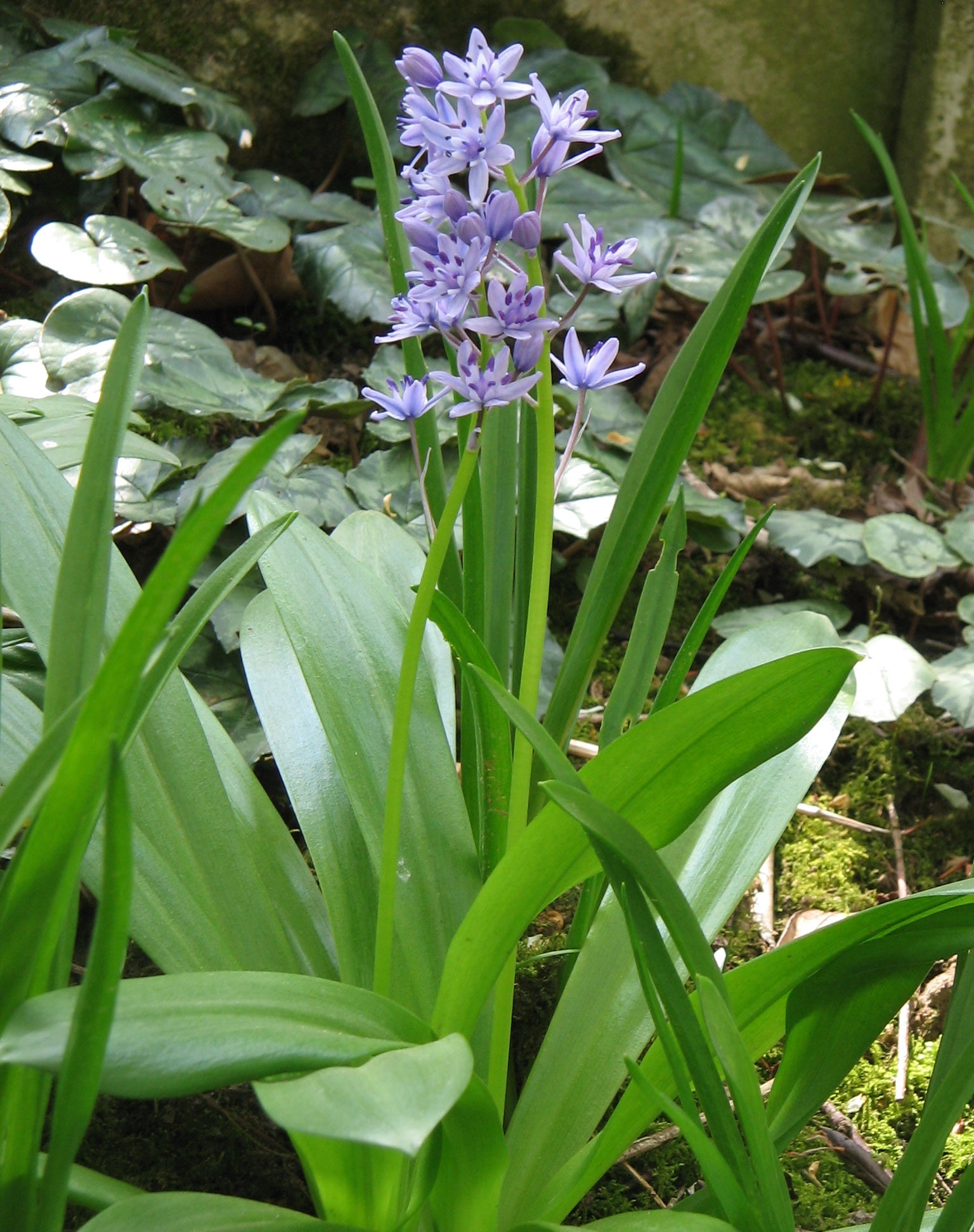 Pyrenian Squill is a perennial that forms large scaly bulbs, from which new growth appears in spring and early summer. It produces large and attractive glossy foliage up to 12" long, and 2-3" wide. There are two to three flower stems producing 5–15 upright flowers in a dense, cone-shape.