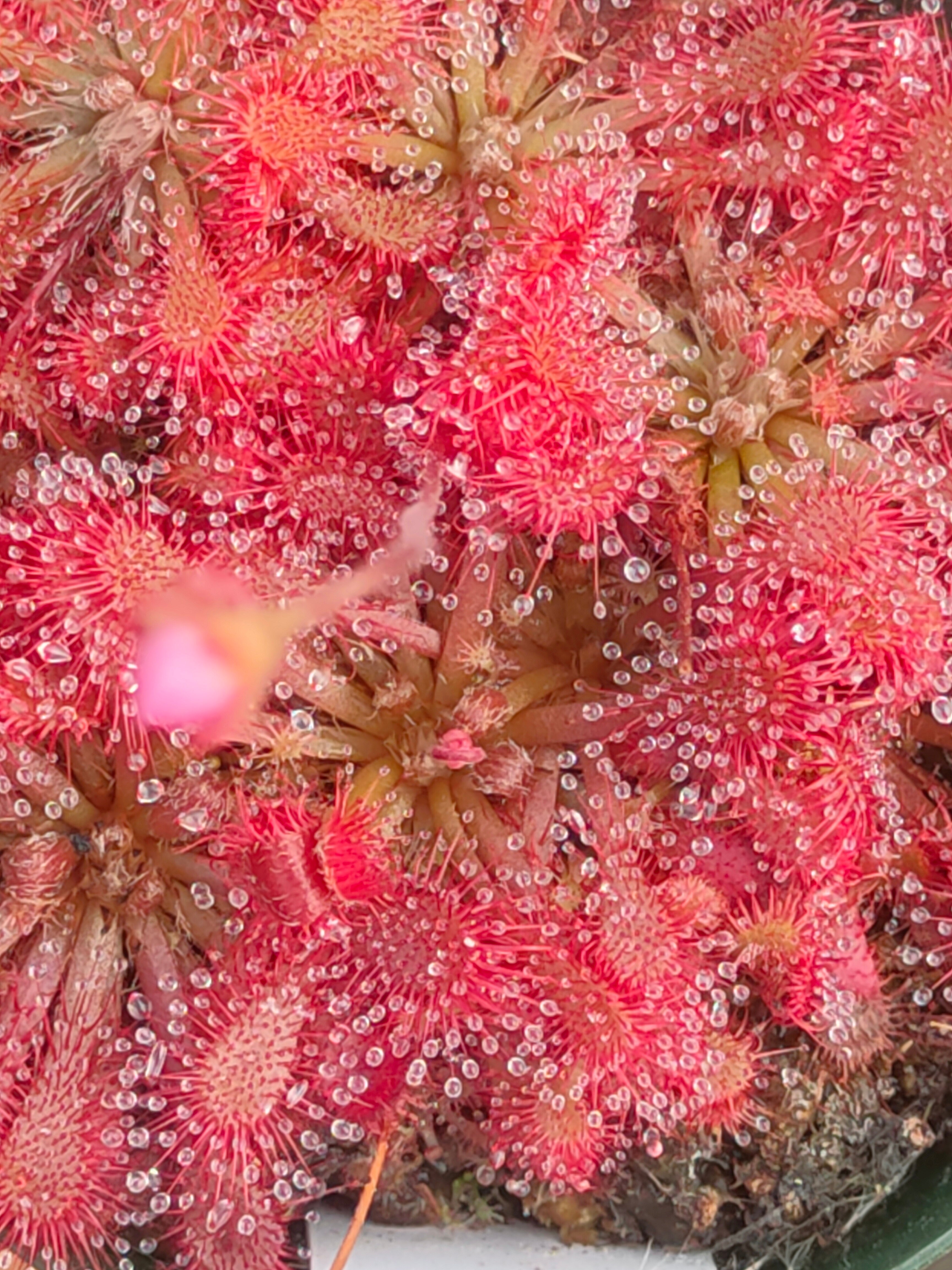 Drosera spatulata, the spoon-leaved sundew, is most often grown indoors as a house plant. These plants will form a dense colony of compact, low growing, rosette shaped sundews once they start flowering.