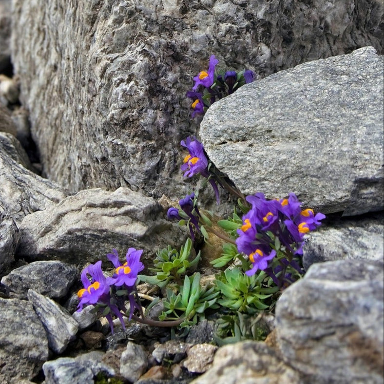 Linaria alpina, sometimes called alpine toadflax, is a blue/purple flowered perennial found in many mountain ranges in southern and central Europe. Linaria Alpina is an easy to care perennial flower that grows well in full sun and sandy, well drained soil. It has blue/purple flowers, with orange lobes in the centre.