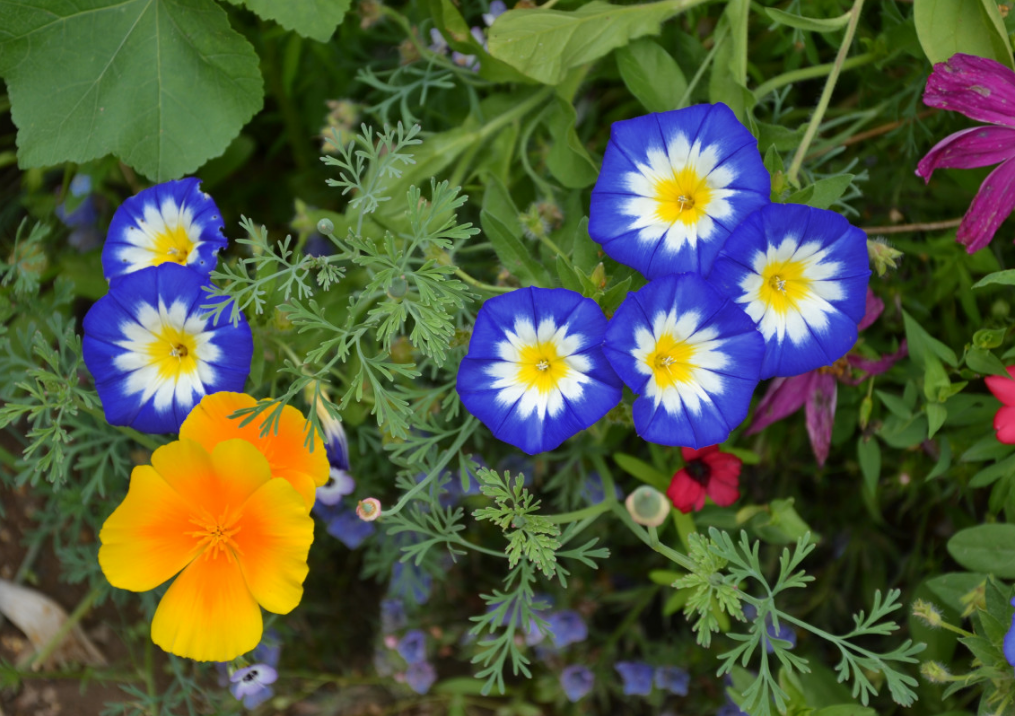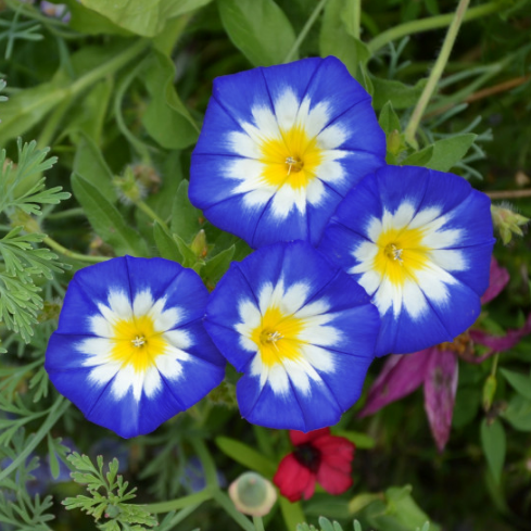 Stunning blue flowers with white throats and yellow centres make an eye-catching bedding display throughout the summer months, and are constantly blooming! This is more of a spreading Morning Glory, if allowed to grow over a wall it can make a cascading spectacle!