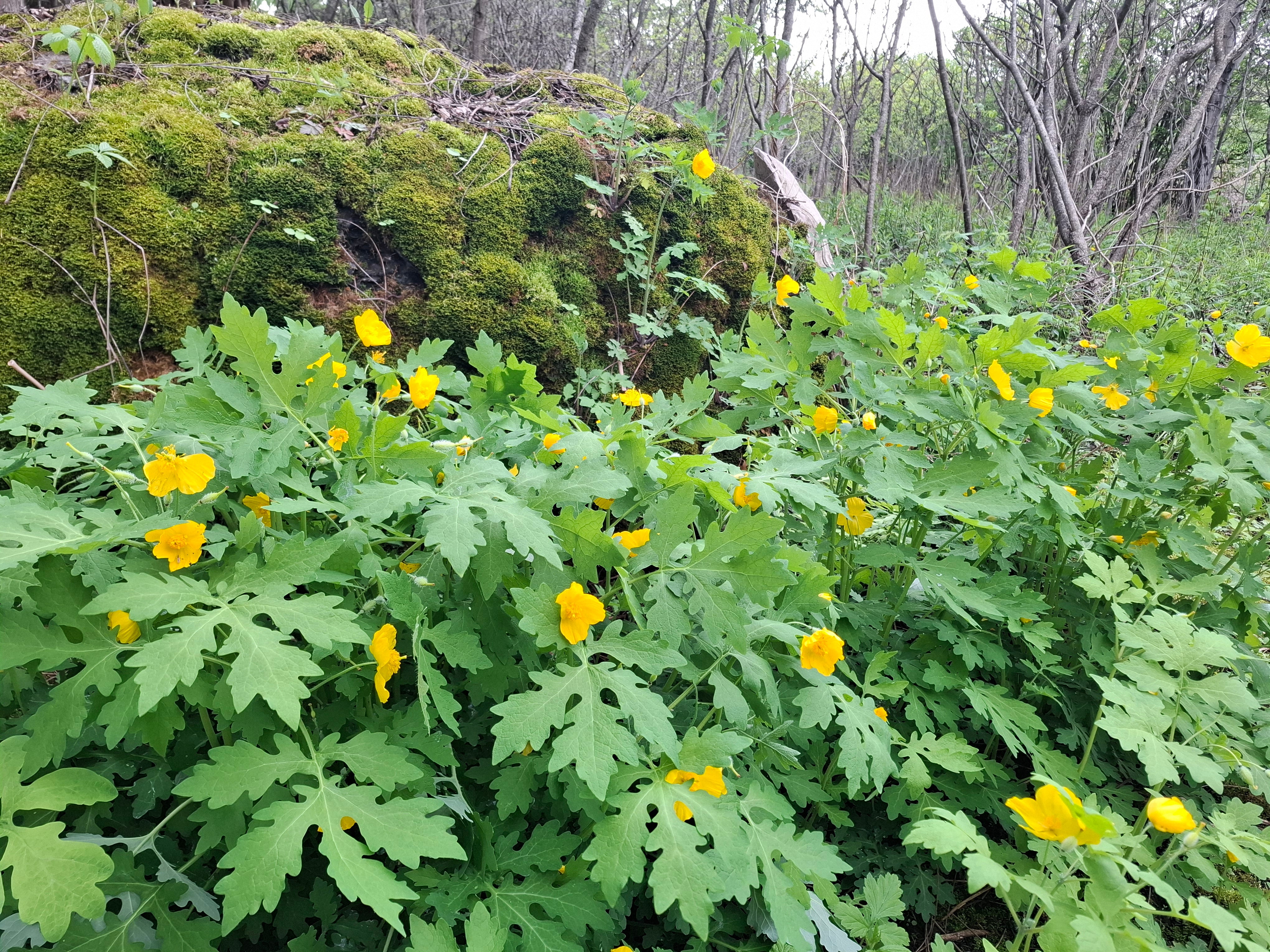 In spring and early summer the deep yellow flowers of the celandine poppy appear as a brilliant display on the forest floor. The flowers have 4 yellow petals, and many yellow-orange stamens. Plants grow to about 1.5 feet (0.46 m) tall, from underground rhizomes. Leaves are cut and lobed.