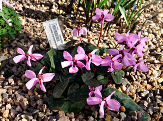 A pretty Cyclamen with oval to round leaves, green and often variegated with silver above, and red-purple below. The flowers have five petals, pale rose-pink to pink-carmine or white with a dark magenta spot at the nose. The petals are spreading rather than upswept, and often twisted. The plants form tubers.