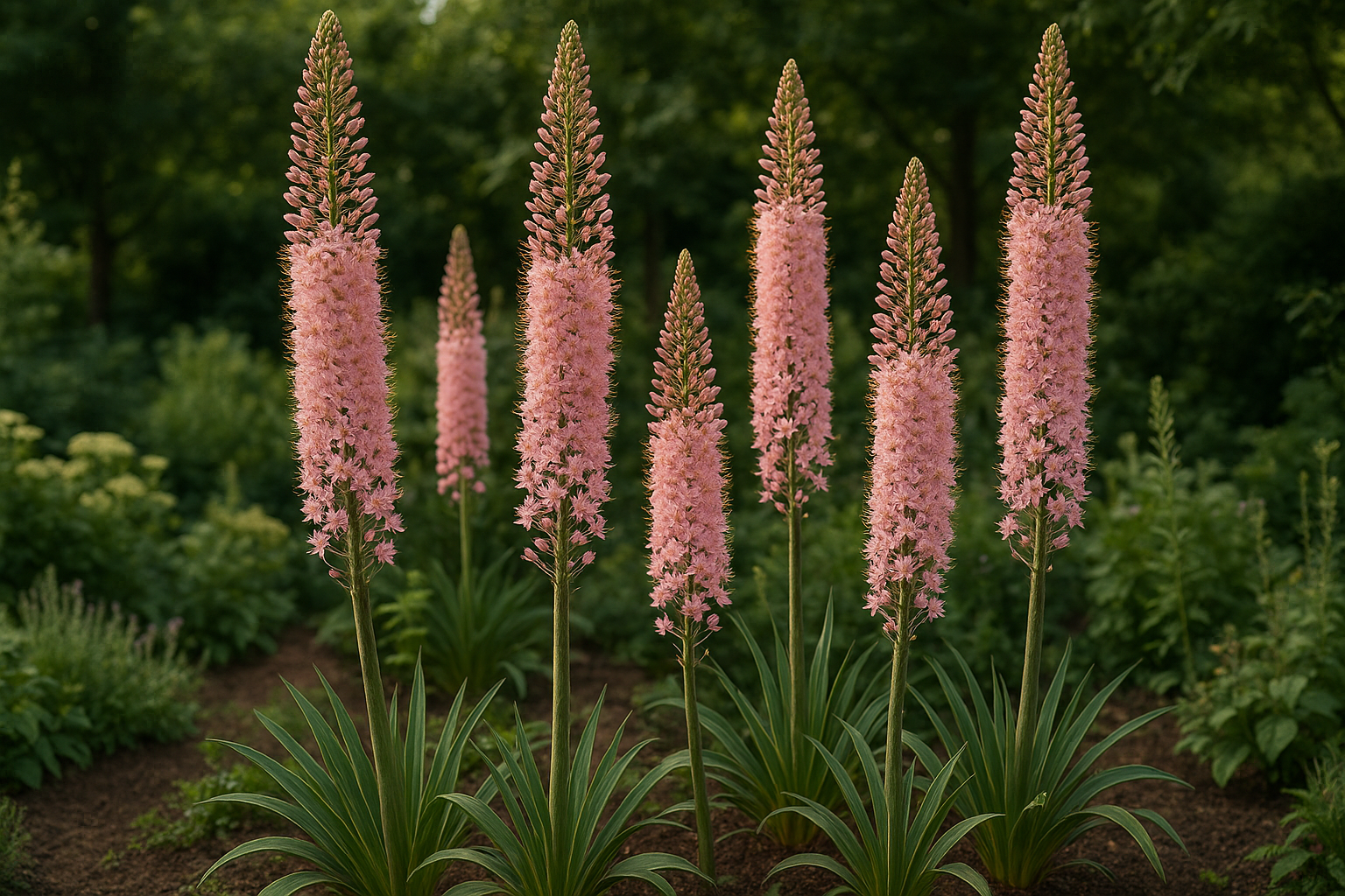Eremurus aitchisonii is a perennial flower, also known as the foxtail lilies or desert candles. The inflorescence (flowers) look similar to a long spike or a bottlebrush, and consist of many soft-pink flowers. They bloom in late spring and into summer. The leaves grow in tufts of green straplike strips. Tolerant of dry soils. Makes an excellent cut-flower. Attracts pollinators.