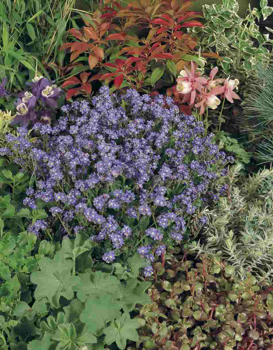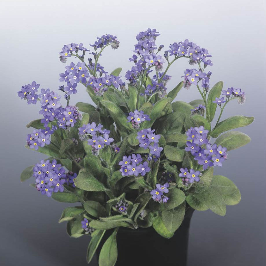The plants form compact domes, topped with sprays of blue forget-me-not flowers. This plant will very gently self-seed making a carpet loaded with blue flowers! Can also be used as a potted plant.