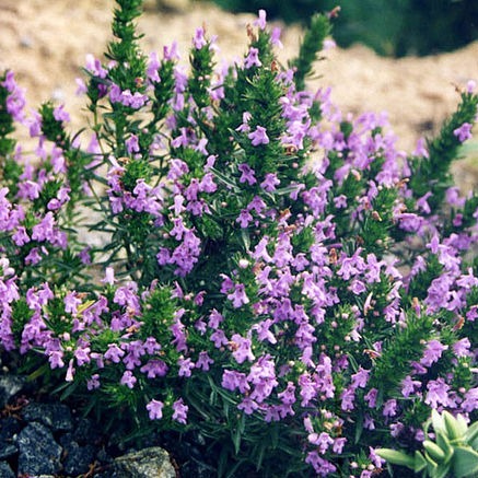 A compact savory with showy bright purple flowers! Winter savory, is a small shrub with an abundance blooms and aromatic dark green leaves that turn purple in winter. Excellent for pot culture and also for stone walls. Drought tolerant.