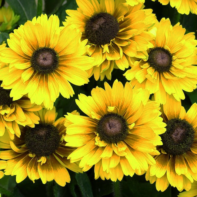 Large double flowers with deep black center! Flowers all season from June to October. Will bloom the first year from seed like an annual, though it is a perennial.