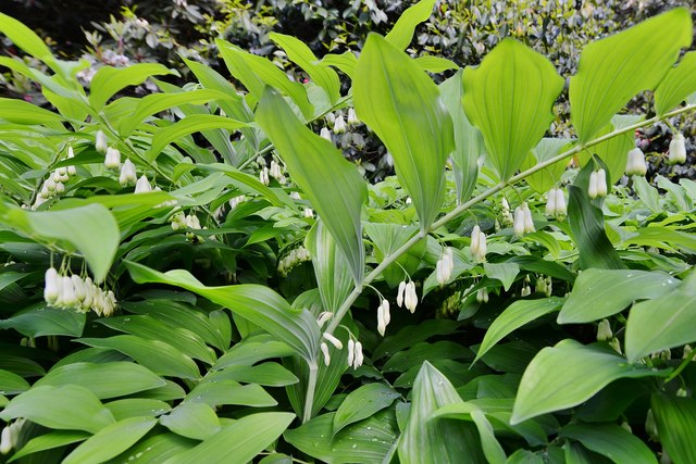 Polygonatum multiflorum, the Solomon's seal, David's harp, ladder-to-heaven or Eurasian Solomon's seal, is a rhizomatous perennial growing to 90 cm (35 in) tall by 25 cm (10 in) broad, with arching stems of alternate leaves, and slightly necked, pendent tubular white flowers with green tips, hanging from the undersides of the stems. It is valued in cultivation for its ability to colonize shady areas, and is suitable for a woodland style planting.
