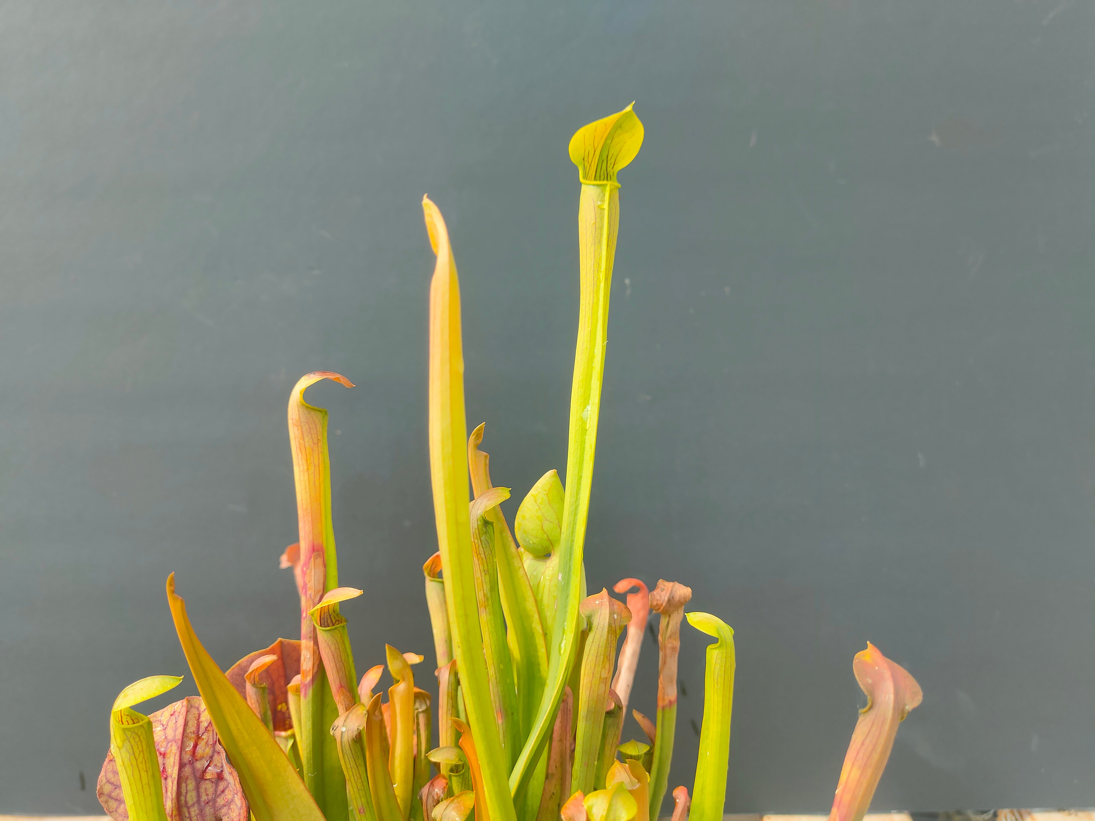 Sarracenia alata, also known as yellow trumpets, pale pitcher plant or pale trumpet, forms tall, upright pitchers with a spade shaped lid. Often has distinct red veination on the inside of the pitcher.